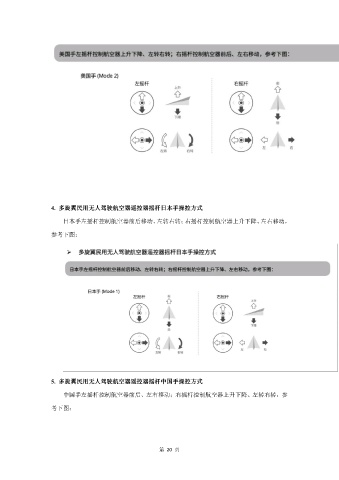 4. 多旋翼民用无人驾驶航空器遥控器摇杆日本手操控方式 日本手左摇杆控制航空器前后移动、左转右转;右摇杆控制航空器上升下降、左右移动, 参考下图: 5. 多旋翼民用无人驾驶航空器遥控器摇杆中国手操控方式 中国手左摇杆控制航空器前后、左右移动;右摇杆控制航空器上升下降、左转右转,参 考下图: 第 20 页